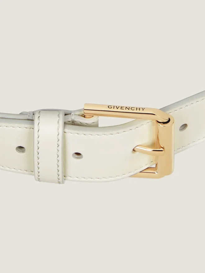 Long Belt in Shiny Calfskin Leather. Voyou Line. Givenchy Engraved Metal End-Tip. Golden-Finish Metal Details.