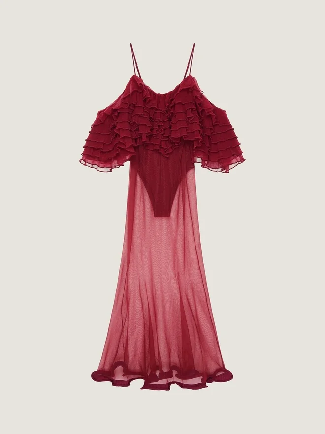 Long Dress in Transparent Ultra-Fine Knit. Ruffles on the Top. Thin Adjustable Straps. Integrated Bodysuit with Snap Closure at